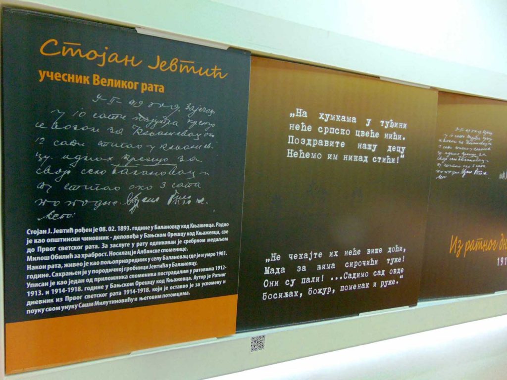 Изложба је инспирисана ратним дневником борца 14. пешадијског пука српске војске Стојана Ј. Јевтића и отворена је у склопу реализације пројекта ,,Ратни дневник из Првог светског рата 1914–1918. Стојана Ј. Јевтића“, који је подржало Министарство културе и информисања Републике Србије.